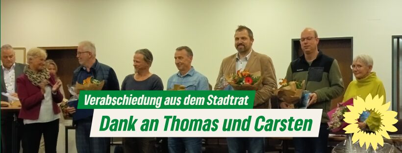 Die Fraktion BÜNDNIS 90/DIE GRÜNEN in Kierspe dankt Thomas Nies und Carsten Gregor von Herzen für ihre langjährige und engagierte Ratsarbeit. Beide haben durch ihren Einsatz und ihre Haltung die grüne Kommunalpolitik in Kierspe geprägt. Wir freuen uns sehr, dass sie uns weiterhin als sachkundige Bürger unterstützen und gemeinsam mit uns die Zukunft unserer Stadt aktiv mitgestalten.